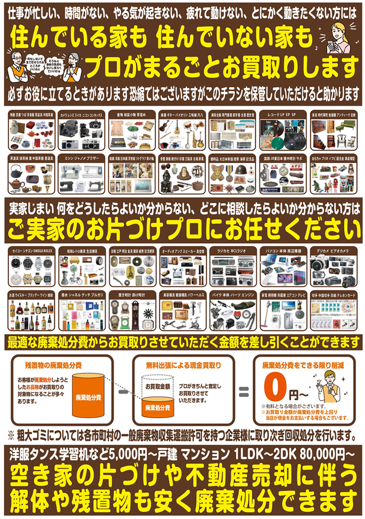 遺品整理がしたい・仕事が忙しい・お片づけがしたい・時間がない・残置物を廃棄したい・疲れて動けない・不動産を売却したい・身体に負担を掛けたくない・解体を安くしたい・ケガをしたくない・お金がない・やる気が起きない・見積もりを取るのが面倒くさい・遠方にいて何もできない・誰も頼れない・人と話したくない・安価で済ませたい・とにかく何でもお金に換金したい方は、実家じまいのプロに全てお任せください。自信をもってコンサルティングさせていただきます。