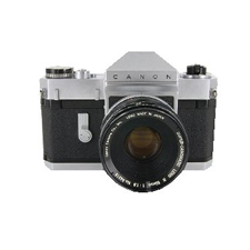 1959年5月に発売されたキヤノンフレックスはボディ側の外爪を包み込むようにしてレンズを装着する摺動面を持たないブリーチロック式という高級マウントを採用しています スーパーキャノマチックと名付けられた高速で作動する完全自動絞り機構底部トリガー130度回転による迅速巻き上げ等の機能と外付け式セレン光電池式露出計の使用可能を特徴としていました 1962年にはキヤノンフレックスRMを発売します 大型のシャッターダイアルの回転に連動して対応する適正の絞り値を読み取るセレン光電池式の露出計を内蔵しています
